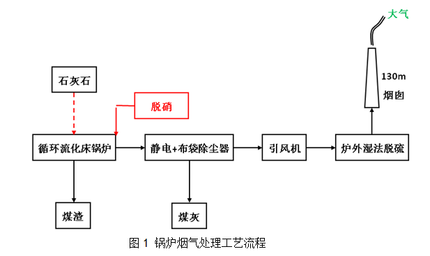 公司配套的熱電廠建設有2190t/h環保型低氮燃燒循環流化床鍋爐。 鍋爐煙氣通過鍋爐爐內脫硫(備用)、脫硝、靜電+布袋除塵工藝、爐外脫硫處理工藝,確保熱電廠鍋爐煙氣通過130m煙囪達標排放,工藝流程如下: