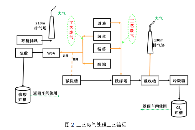 工藝廢氣采用1套處理能力為100,000m3/hWSA處理工藝和4套處理能力分別為60,000m3/h的“堿洗+吸附+冷凝回收”廢氣處理裝置進行處理,其中“堿洗+吸附”的尾氣進入電廠循環流化床鍋爐進行燃燒以進一步減輕對環境的污染,WSA尾氣及車間環境排風由210m排氣塔排放。WSA 及“堿洗+吸附+冷凝回收”工藝流程如下: