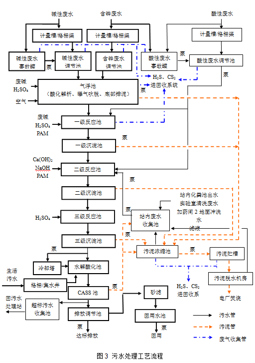 生產過程中產生的生產廢水及生活污水經收集處理后全部進入日處理能力6萬噸的污水處理廠進行處理,污水廠采用“并列的物化+生化”二級處理工藝,即并列的酸堿廢水混合中和、曝氣吹脫去除H2S、投加石灰乳沉淀去除鋅的一級物化處理工藝,加上CASS工藝的二級生化處理工藝,將處理達標的污水通過排海管道排向指定海域。為防止污水處理廠運行超負荷,建設有24000m3事故應急罐,以攔截生產過程中可能產生的異常來水。