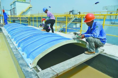 在污水處理廠,工人們忙著用一塊塊大型的藍(lán)色玻璃鋼蓋住污水池。由于污水廠生化池曝氣時(shí)會(huì)產(chǎn)生“臭氣”,為此,公司投資2000多萬元,采用加蓋方式對污水廠廢氣進(jìn)行收集和除臭處理。該公司副總經(jīng)理鄭超說,為達(dá)到有效治理,公司和環(huán)保部門專家一起前往重慶、江蘇等地實(shí)地考察。上月,施工單位開始進(jìn)廠施工,加蓋的面積達(dá)到1萬平方米,爭取在9月底完成。加蓋的材料是玻璃鋼,耐腐蝕、耐紫外線,此外安裝了抽風(fēng)機(jī),可以將廢氣有效收集進(jìn)行處理。