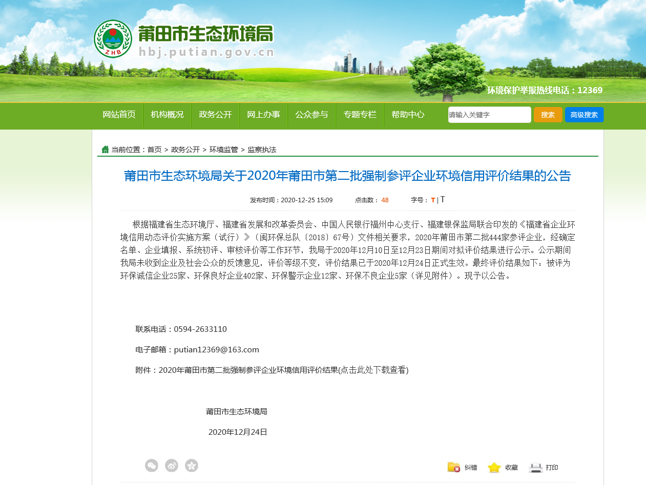 2020年12月25日,福建省莆田市生態環境局發布了《莆田市生態環境局關于2020年莆田市第二批強制參評企業環境信用評價結果的公告》。